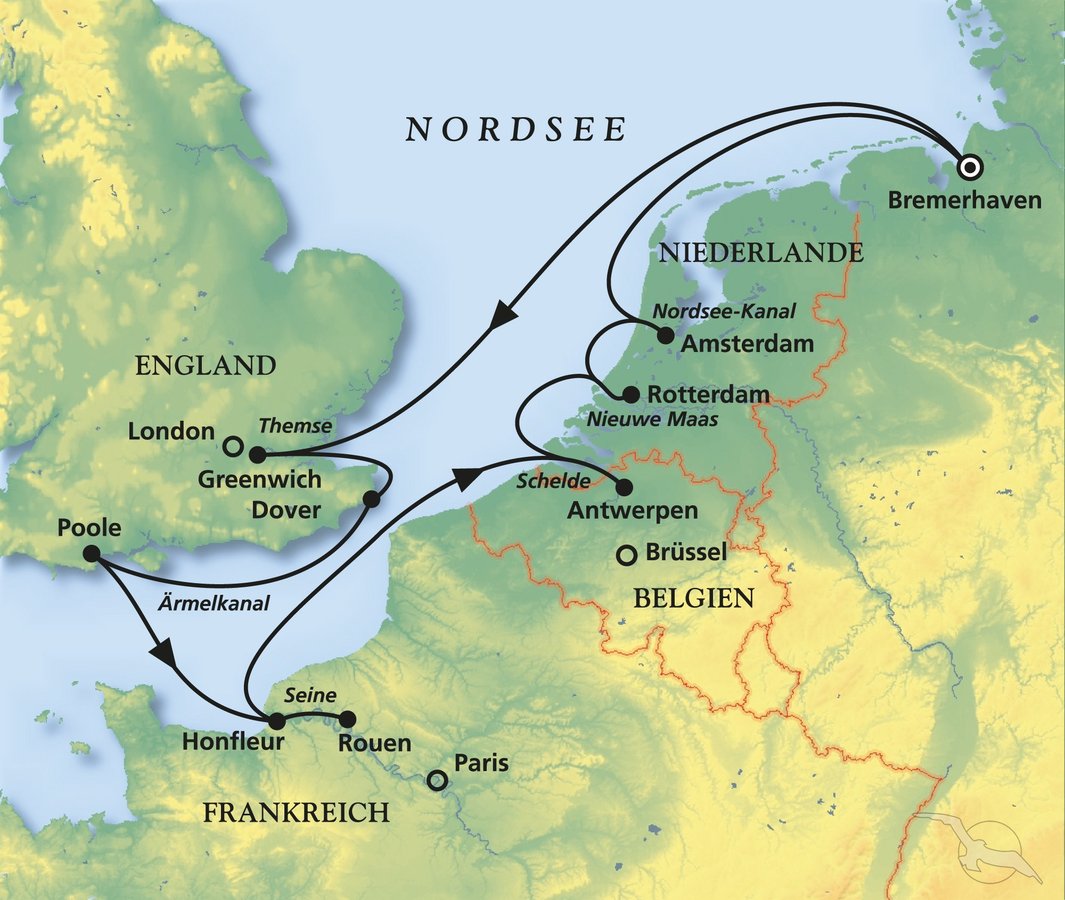 Reise: Reise-Nr.: DEU062 - Entdeckerfahrt zu Küsten und Flüssen Westeuropas Datum: Vom 22.04.2022 bis zum 02.05.2022 (10 Tage)