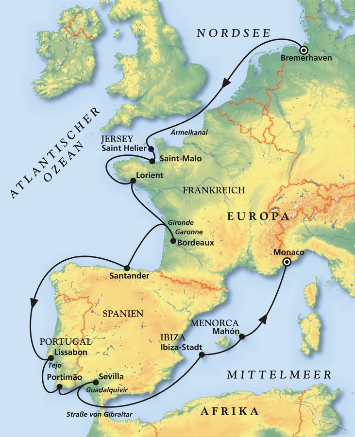 Im Frühsommer geht MS Deutschland auf eine Reise zu den schönsten Zielen Westeuropas, die von der Nordsee ins Mittelmeer führt. Genießen Sie die wunderbare Kreuzfahrtkomposition aus französischem savoir-vivre auf den Kanalinseln und dem nördlichen Festland, portugiesischen Fadoklängen in Lissabon sowie spanischer Lässigkeit in Sevilla und auf den Balearen.