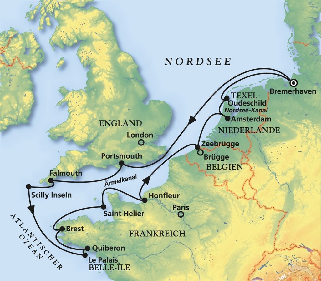 Reise: Reise-Nr.: DEU077 - Käptn`s Lieblingsziele an Westeuropas Küsten Datum: Vom 20.07.2023 bis zum 01.08.2023 (12 Tage)