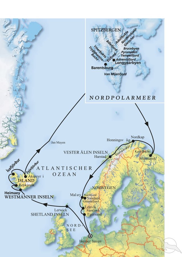 Mit Ihrer MS Deutschland erleben Sie einen einzigartigen Sommer während dieser 20-tägigen Traumkreuzfahrt, die ganz den nördlichen Gefilden gewidmet ist. Die Shetland und Westmänner Inseln bilden den Auftakt zu einer Reihe wundervoller Erlebnisse und Momente. Island, die "Insel aus Feuer und Eis" verzaubert ihre Besucher mit einer Mischung aus Trollgeschichten und Naturphänomenen. Mit Spitzbergen servieren wir Ihnen einen ganz besonderen Leckerbissen für die Augen, ehe Ihre MS Deutschland Kurs auf die russische Nordmeerküste nimmt. Entlang der norwegischen Küste, durch wunderschöne Fjorde zu heimeligen Örtchen, kreuzt Ihr persönliches Traumschiff Bremerhaven entgegen, wo es für dieses Mal Abschied nehmen heißt.